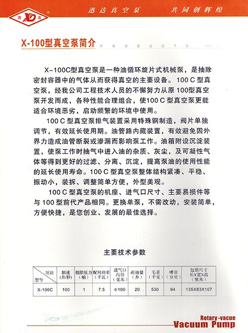 Product name: 迅達(dá)牌X-100C型旋片式真空泵 Product material: 鑄鐵 Driving mode: 電動(dòng) Pumping speed: 100(L/S) Product power: 7.5kw Extreme pressure: 1(pa) Outline size: 135*83*107 Inlet diameter: φ100mm